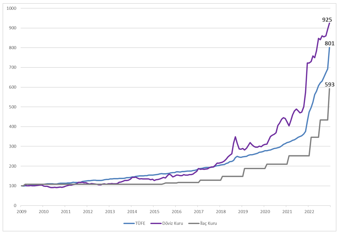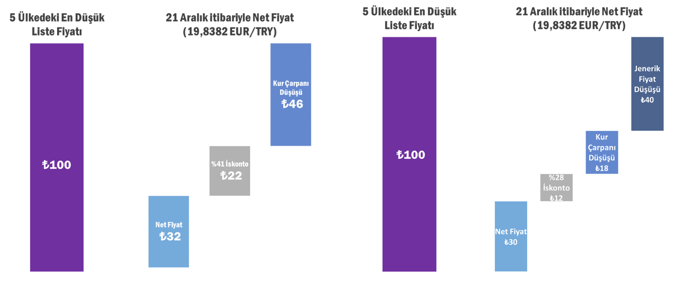 14 Aralık 2022 tarihli ve 32043 sayılı Resmi Gazetede yayımlanan “Beşeri Tıbbi Ürünlerin Fiyatlandırılmasına Dair Kararda Değişiklik Yapılması Hakkında Karar” ile 15 Aralık 2022 tarihinden geçerli olmak üzere ilaç fiyatlandırmasında kullanılacak Avro değeri %36,77 oranında artırılarak 7,8656 TL’den 10,7577 TL olarak belirlenmiş, bu artış uygulanırken FDK oranlarında mahsuplaşma işleminin yapılmayacağı, belirlenen Avro değerinin 2023 yılı için de uygulanmaya devam edileceği ve 2023 yılı Şubat ayında ayrıca yeni bir Avro güncellemesinin yapılmayacağı belirtilmiştir. Beşeri Tıbbi Ürünlerin Fiyatlandırılmasına Dair Karar’ın 2 nci maddesinin onuncu fıkrasında bahsi geçen barem değerleri de, fiyat korumalı ürünlerde 37,10 TL ve diğer ürünlerde 19,39 TL olarak güncellenmiştir. |