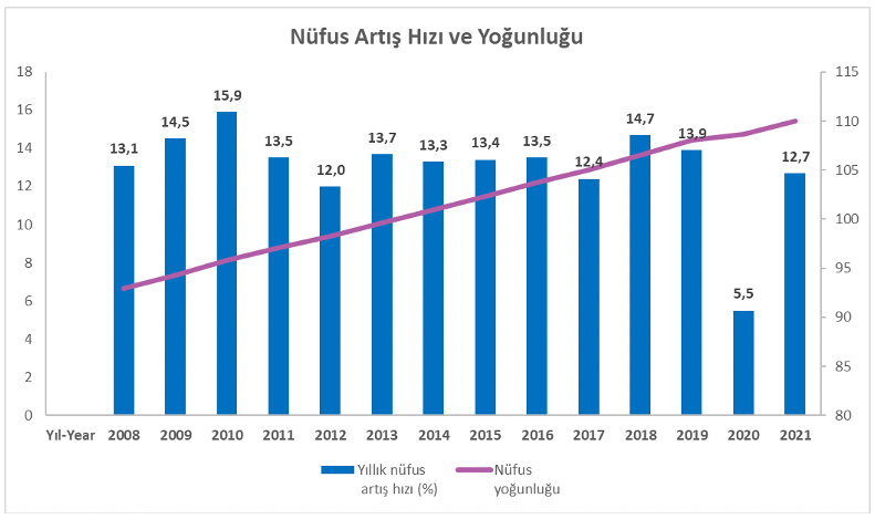 Türkiye nüfusu 2021 yılı itibariyle 84,6 milyondur ve nüfus artış hızı ise %12,7 olarak tespit edilmiştir. Türkiye İstatistik Kurumu (TÜİK) tahminlerine göre, Türkiye nüfusunun 2023’te 86,9 milyon, 2040’ta 100,3 milyon ve 2060’da 107,1 milyon olması öngörülmektedir. Nüfus büyüklüğü yanında nüfus yapısı da büyük önem taşımaktadır.
